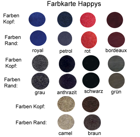 | Unkompliziert und lässig, der Happy Topfhut mit Biesen-Kopf. In drei verschiedenen Kopfformen (Aufschlag-, Drapee-, Biesen-Kopf) und zehn Farben bzw. hundert Farbkombinationen. Siehe Beschreibung Happys. Ab 250,- €. |