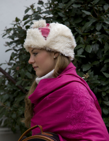 | Die Tschapka ist ursprünglich die Kopfbedeckung der polnischen Ulanen. Unsere Variante ist kuschelig warm und durch das pink-rosa Rosenmuster (siehe Modell Taiga) sehr weiblich und ein bisschen schrill. Mit hochgebundenen Ohrenklappen als Kappe, heruntergeklappt für warme Ohren, Wangen und Hals. Ab 220,- €. |