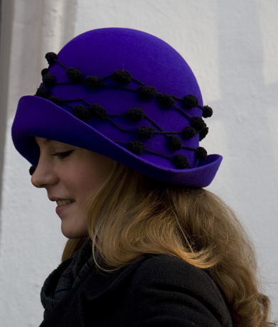 | Der Aufschlaghut erinnert an die 20er Jahre. Durch die Dekoration mit Pompon-Wolle wirkt er besonders filigran. Material: violetter Haarfilz. Ab 390,- €. |